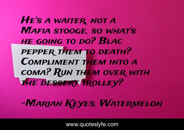 This page presents the quote "He's a waiter, not a Mafia stooge, so what's he going to do? Blac pepper them to death? Compliment them into a coma? Run them over with the dessert trolley?". Author of this quote is Marian Keyes, Watermelon. This quote is about cheat, betrayal, love, affection, fling,.