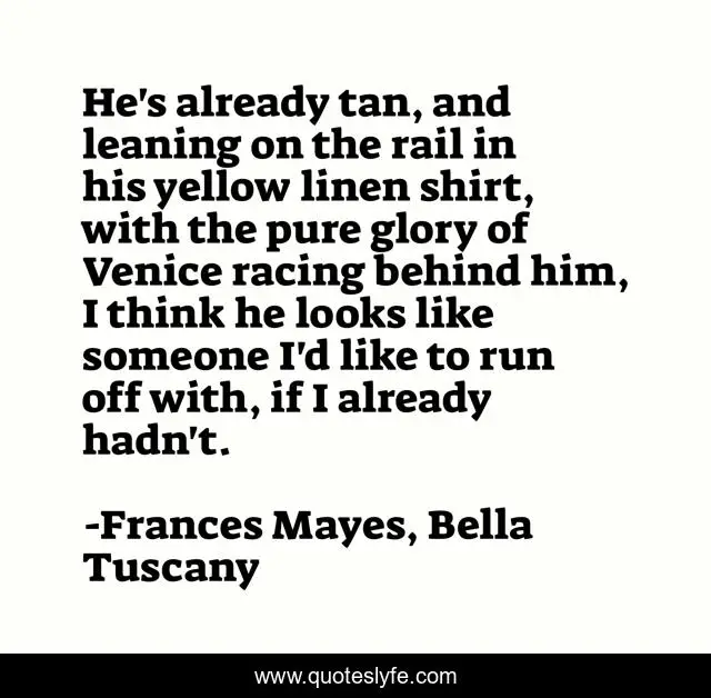This page presents the quote "He's already tan, and leaning on the rail in his yellow linen shirt, with the pure glory of Venice racing behind him, I think he looks like someone I'd like to run off with, if I already hadn't.". Author of this quote is Frances Mayes, Bella Tuscany. This quote is about italy, love-at-first-sight, tuscany, love-story, lover, love, lovequotes, affection,.