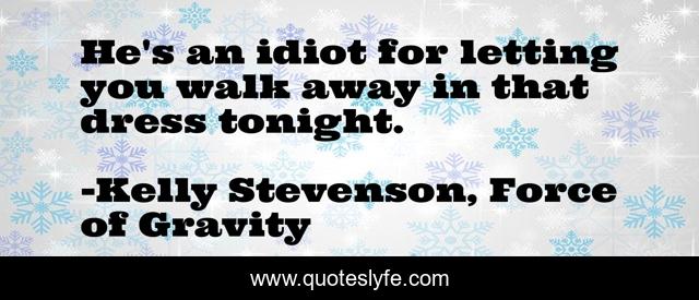 This page presents the quote "He's an idiot for letting you walk away in that dress tonight.". Author of this quote is Kelly Stevenson, Force of Gravity. This quote is about new-adult-romance, teen-fiction, student-teacher-affair, contemporary-romance,.