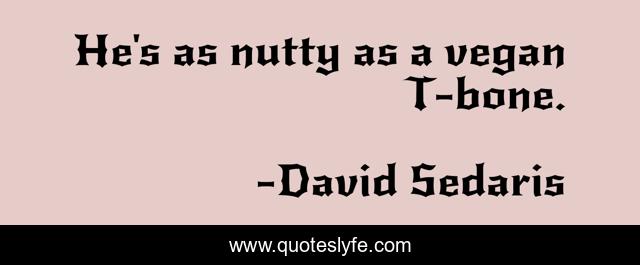 This page presents the quote "He's as nutty as a vegan T-bone.". Author of this quote is David Sedaris. This quote is about simile, crazy, vegan,.