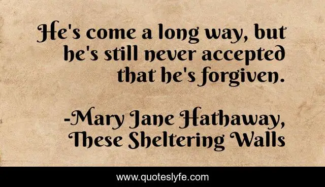 This page presents the quote "He's come a long way, but he's still never accepted that he's forgiven.". Author of this quote is Mary Jane Hathaway, These Sheltering Walls. .