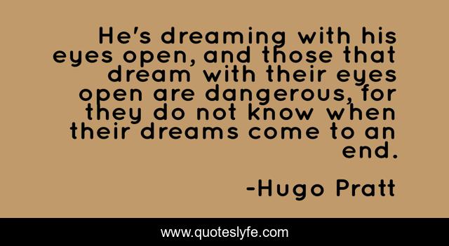This page presents the quote "He's dreaming with his eyes open, and those that dream with their eyes open are dangerous, for they do not know when their dreams come to an end.". Author of this quote is Hugo Pratt. This quote is about end, eyes, dream,.