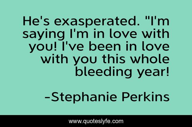 This page presents the quote "He's exasperated. "I'm saying I'm in love with you! I've been in love with you this whole bleeding year!". Author of this quote is Stephanie Perkins. This quote is about ettiene-st-clair, love, ya, young-adult-romance, anna-and-the-french-kiss, romance, affection,.