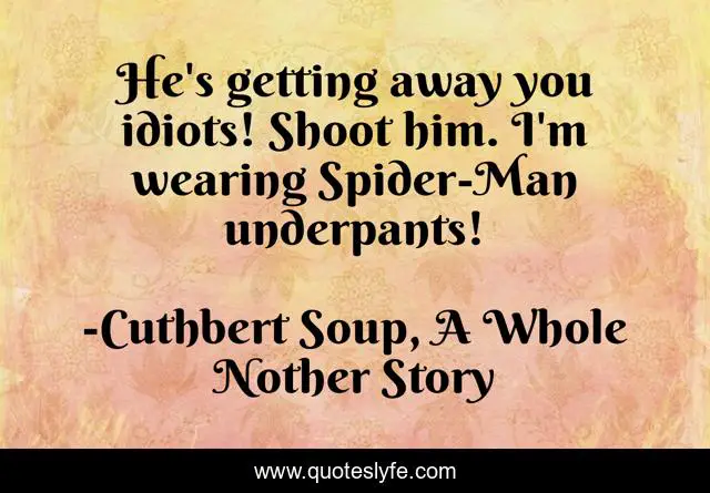 This page presents the quote "He's getting away you idiots! Shoot him. I'm wearing Spider-Man underpants!". Author of this quote is Cuthbert Soup, A Whole Nother Story. This quote is about funny, comedy,.