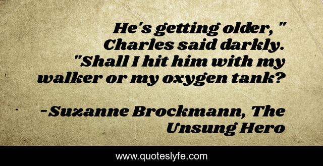 This page presents the quote "He's getting older, " Charles said darkly. "Shall I hit him with my walker or my oxygen tank?". Author of this quote is Suzanne Brockmann, The Unsung Hero. This quote is about humor, life-experience,.
