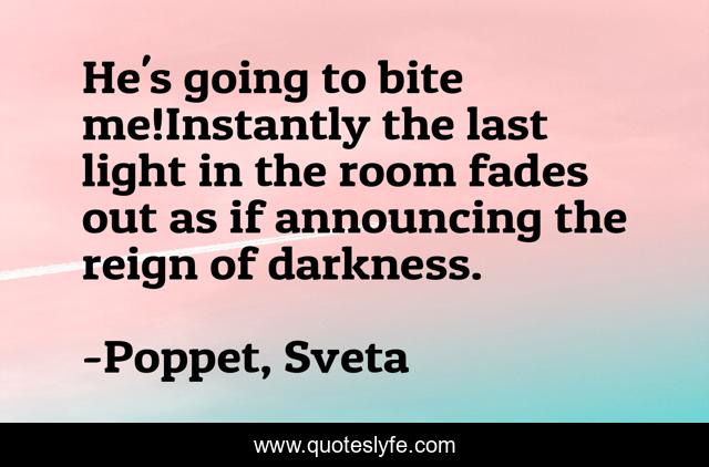 This page presents the quote "He's going to bite me!Instantly the last light in the room fades out as if announcing the reign of darkness.". Author of this quote is Poppet, Sveta. This quote is about paranormal-romance, vampire-romance,.