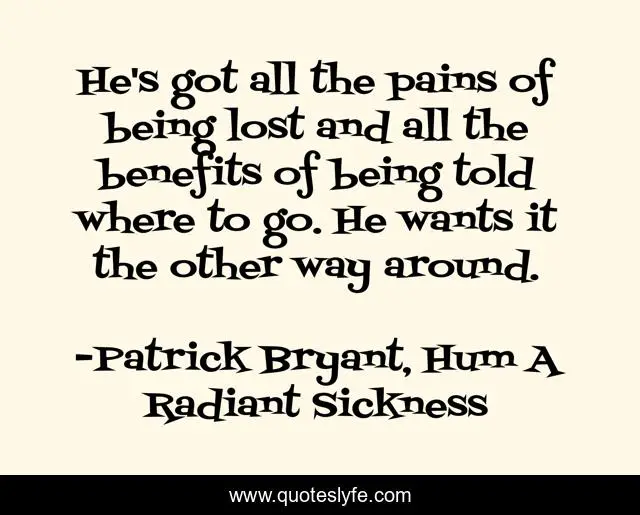 This page presents the quote "He's got all the pains of being lost and all the benefits of being told where to go. He wants it the other way around.". Author of this quote is Patrick Bryant, Hum A Radiant Sickness. This quote is about self-discovery, coming-of-age, self-realization,.