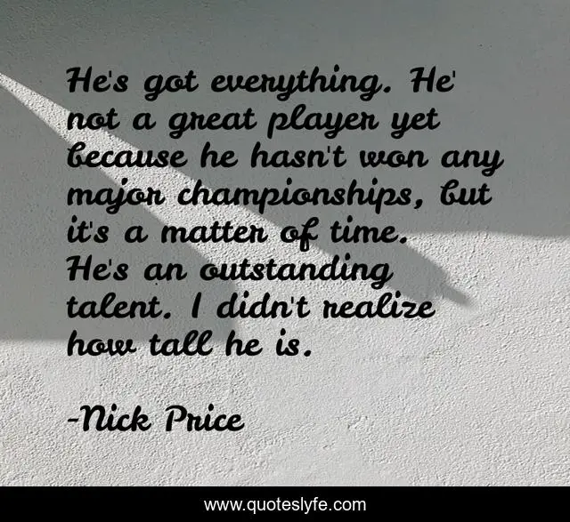This page presents the quote "He's got everything. He' not a great player yet because he hasn't won any major championships, but it's a matter of time. He's an outstanding talent. I didn't realize how tall he is.". Author of this quote is Nick Price. This quote is about great, talent, time,.