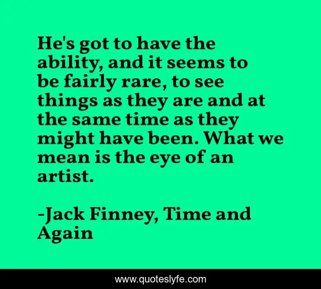 This page presents the quote "He's got to have the ability, and it seems to be fairly rare, to see things as they are and at the same time as they might have been. What we mean is the eye of an artist.". Author of this quote is Jack Finney, Time and Again. This quote is about imagination, leadership, vision, intelligence,.