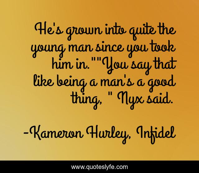 This page presents the quote "He's grown into quite the young man since you took him in.""You say that like being a man's a good thing, " Nyx said.". Author of this quote is Kameron Hurley, Infidel. .
