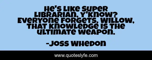 This page presents the quote "He's like Super Librarian, y'know? Everyone forgets, Willow, that knowledge is the ultimate weapon.". Author of this quote is Joss Whedon. This quote is about knowlege, buffy-the-vampire-slayer, humour,.