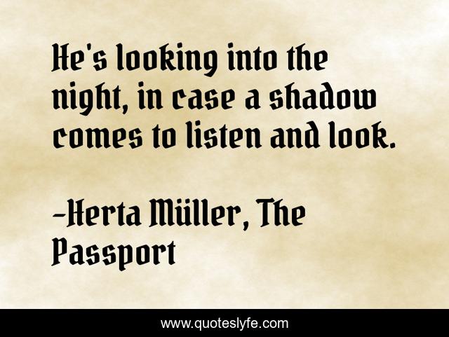 This page presents the quote "He's looking into the night, in case a shadow comes to listen and look.". Author of this quote is Herta Müller, The Passport. This quote is about shadow, night,.