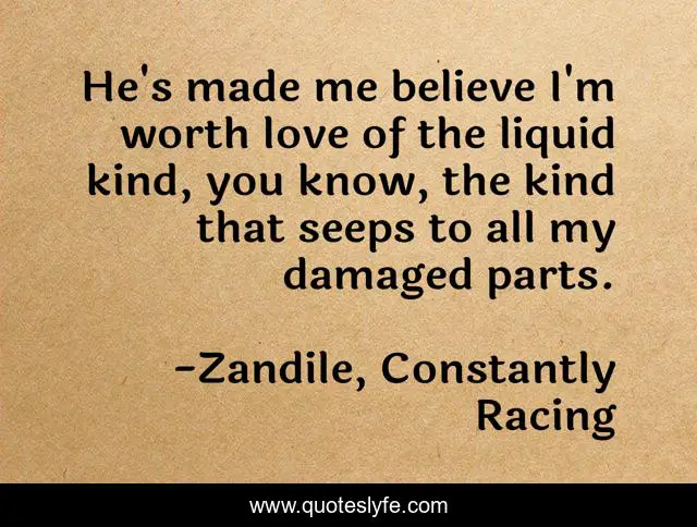 This page presents the quote "He's made me believe I'm worth love of the liquid kind, you know, the kind that seeps to all my damaged parts.". Author of this quote is Zandile, Constantly Racing. This quote is about new-adult, novel, love, soulmates, fiction, romance, young-adult, affection,.