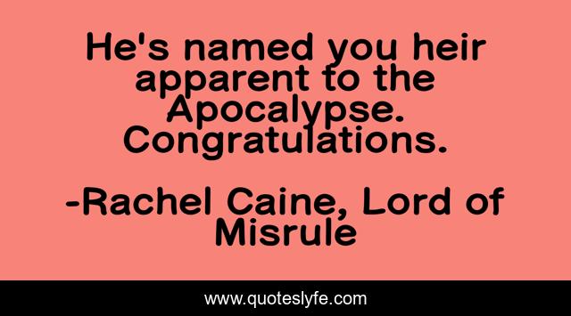 This page presents the quote "He's named you heir apparent to the Apocalypse. Congratulations.". Author of this quote is Rachel Caine, Lord of Misrule. This quote is about morganville-vampires, apocalypse, humor,.