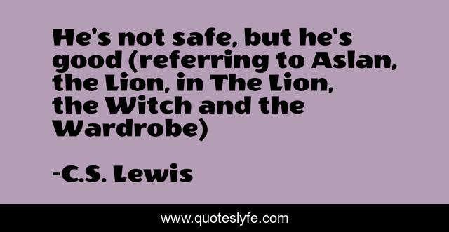 This page presents the quote "He's not safe, but he's good (referring to Aslan, the Lion, in The Lion, the Witch and the Wardrobe)". Author of this quote is C.S. Lewis. This quote is about fantasy, security, safety, goodness, god,.