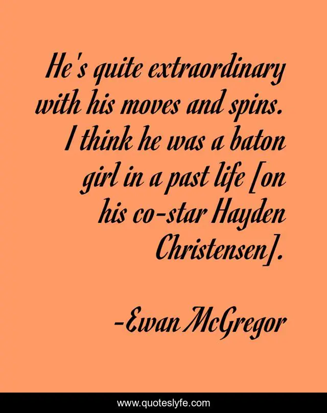 This page presents the quote "He's quite extraordinary with his moves and spins. I think he was a baton girl in a past life [on his co-star Hayden Christensen].". Author of this quote is Ewan McGregor. This quote is about funny, actors, humor, comedy, star-wars,.