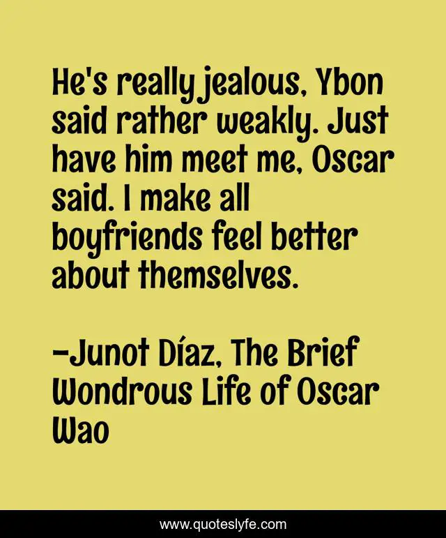 This page presents the quote "He's really jealous, Ybon said rather weakly. Just have him meet me, Oscar said. I make all boyfriends feel better about themselves.". Author of this quote is Junot Díaz, The Brief Wondrous Life of Oscar Wao. This quote is about boyfriends, jealousy, love-triangles,.