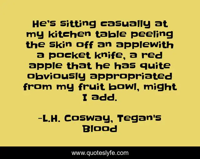 This page presents the quote "He’s sitting casually at my kitchen table peeling the skin off an applewith a pocket knife, a red apple that he has quite obviously appropriated from my fruit bowl, might I add.". Author of this quote is L.H. Cosway, Tegan's Blood. This quote is about funny, break-in, supernatural, comedy, stingy,.