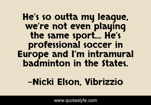 This page presents the quote "He’s so outta my league, we’re not even playing the same sport… He’s professional soccer in Europe and I’m intramural badminton in the States.". Author of this quote is Nicki Elson, Vibrizzio. This quote is about opposites-attract, humor, dating,.