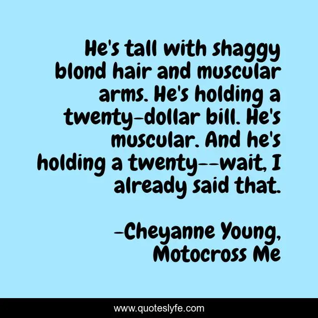 This page presents the quote "He's tall with shaggy blond hair and muscular arms. He's holding a twenty-dollar bill. He's muscular. And he's holding a twenty--wait, I already said that.". Author of this quote is Cheyanne Young, Motocross Me. This quote is about dirt-bikes, motocross, hana, racing, contemporary-romance,.