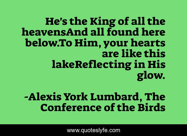 This page presents the quote "He's the King of all the heavensAnd all found here below.To Him, your hearts are like this lakeReflecting in His glow.". Author of this quote is Alexis York Lumbard, The Conference of the Birds. This quote is about heart, heaven, spirituality, god, religion, inspirational, enthusiasm, children,.