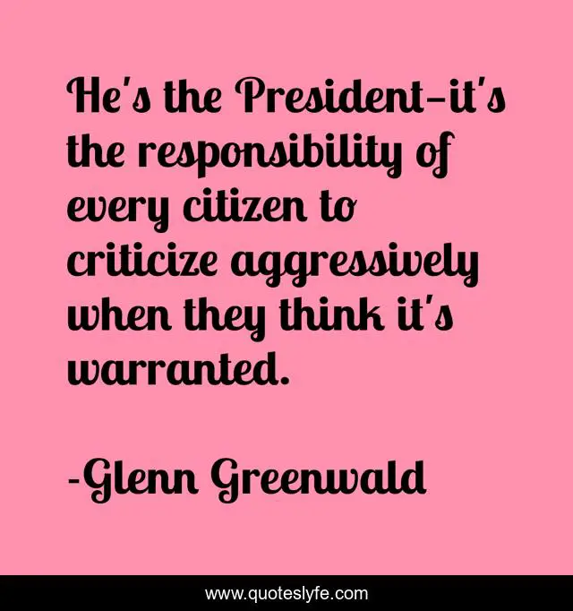 This page presents the quote "He's the President—it's the responsibility of every citizen to criticize aggressively when they think it's warranted.". Author of this quote is Glenn Greenwald. This quote is about criticism, dissent, barack-obama, democracy, politics,.