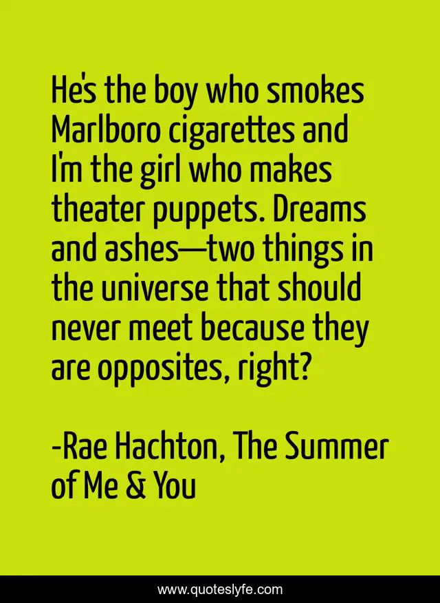 This page presents the quote "He's the boy who smokes Marlboro cigarettes and I'm the girl who makes theater puppets. Dreams and ashes—two things in the universe that should never meet because they are opposites, right?". Author of this quote is Rae Hachton, The Summer of Me & You. This quote is about young-love, contemporary-romance,.