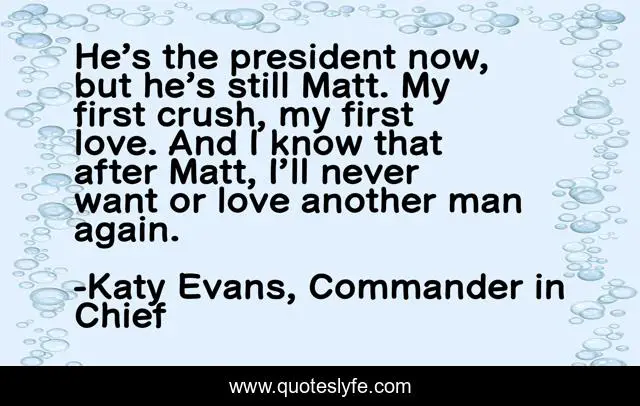 This page presents the quote "He’s the president now, but he’s still Matt. My first crush, my first love. And I know that after Matt, I’ll never want or love another man again.". Author of this quote is Katy Evans, Commander in Chief. This quote is about romance, politics,.