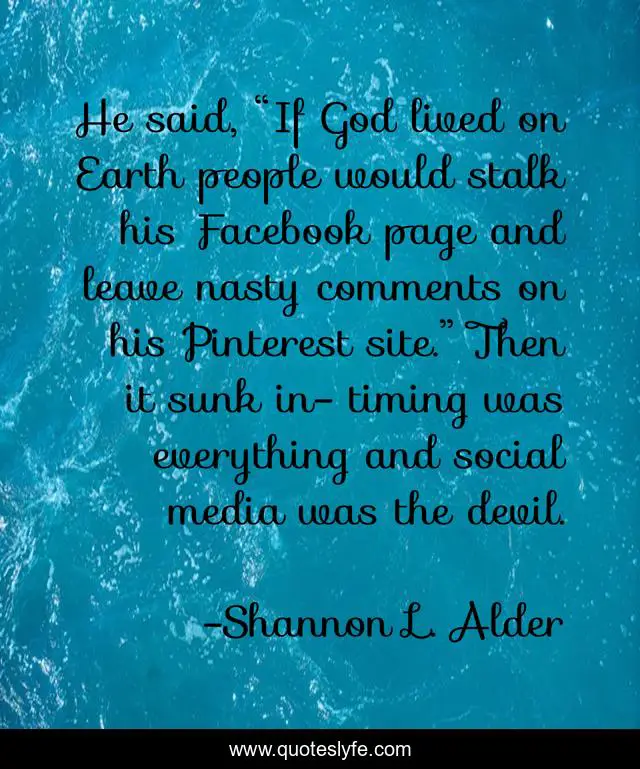 This page presents the quote "He said, “If God lived on Earth people would stalk his Facebook page and leave nasty comments on his Pinterest site.” Then it sunk in- timing was everything and social media was the devil.". Author of this quote is Shannon L. Alder. This quote is about social-media, humor, god, stalkers, jokes, sarcasm, timing, preplanned, dark-humor,.