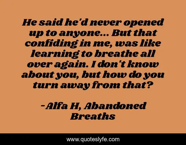 This page presents the quote "He said he'd never opened up to anyone... But that confiding in me, was like learning to breathe all over again. I don't know about you, but how do you turn away from that?". Author of this quote is Alfa H, Abandoned Breaths. This quote is about relationships, life, love, poetry, affection,.