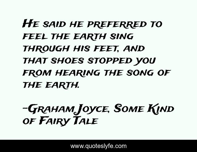 This page presents the quote "He said he preferred to feel the earth sing through his feet, and that shoes stopped you from hearing the song of the earth.". Author of this quote is Graham Joyce, Some Kind of Fairy Tale. This quote is about environmental, earthy, magic,.