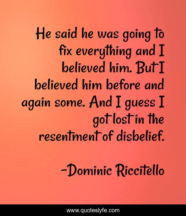 This page presents the quote "He said he was going to fix everything and I believed him. But I believed him before and again some. And I guess I got lost in the resentment of disbelief.". Author of this quote is Dominic Riccitello. This quote is about love, disbelief, lost, quote, fixing-oneself, hurt, resentment, sadness, relationship,.