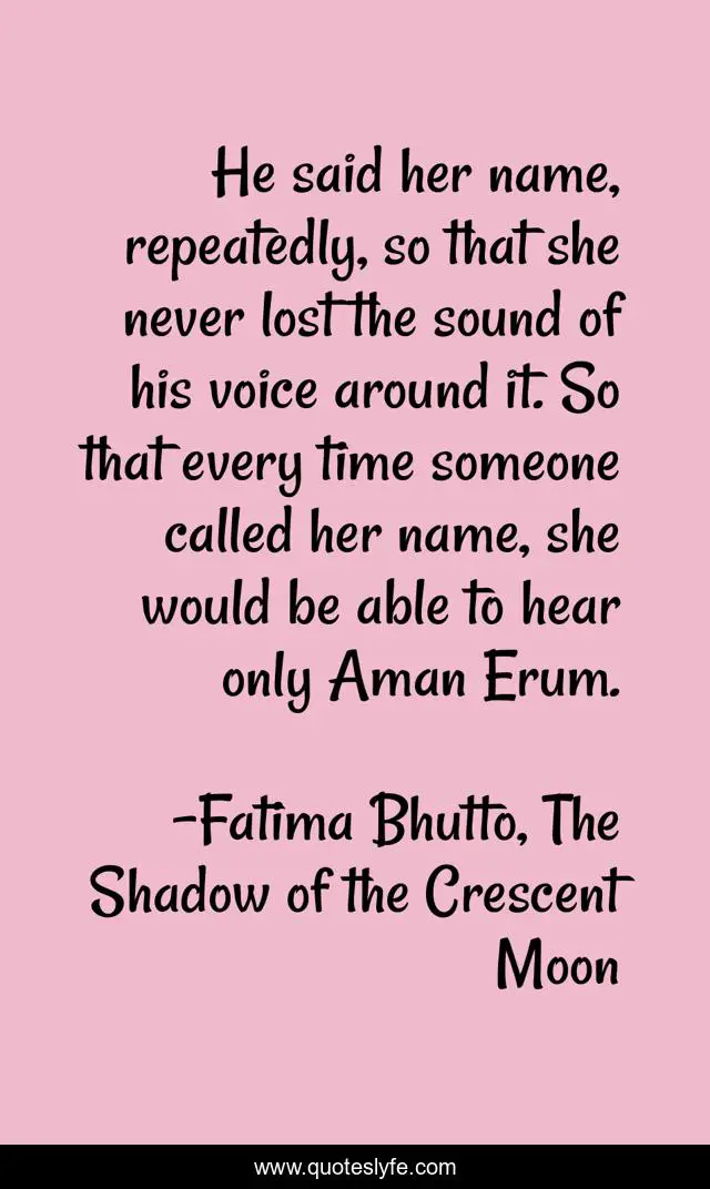 This page presents the quote "He said her name, repeatedly, so that she never lost the sound of his voice around it. So that every time someone called her name, she would be able to hear only Aman Erum.". Author of this quote is Fatima Bhutto, The Shadow of the Crescent Moon. .