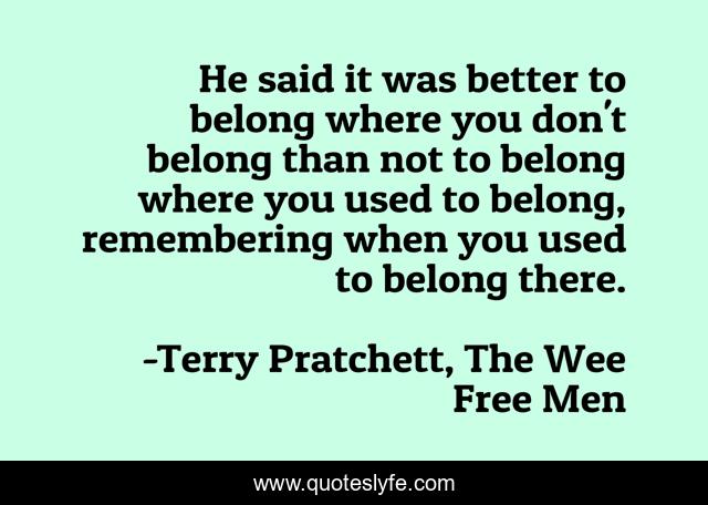 This page presents the quote "He said it was better to belong where you don't belong than not to belong where you used to belong, remembering when you used to belong there.". Author of this quote is Terry Pratchett, The Wee Free Men. This quote is about home, belonging,.