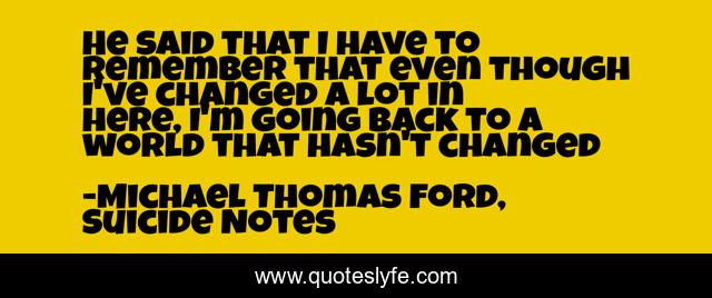 This page presents the quote "He said that I have to remember that even though I've changed a lot in here, I'm going back to a world that hasn't changed". Author of this quote is Michael Thomas Ford, Suicide Notes. This quote is about life, stranger, outcast, mental-hospital, place, experience, dealing-with-people, world, change,.