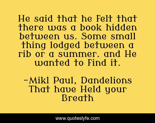 This page presents the quote "He said that he felt that there was a book hidden between us. Some small thing lodged between a rib or a summer. and He wanted to find it.". Author of this quote is Mikl Paul, Dandelions That have Held your Breath. This quote is about prose, prose-poetry, monologue, love-story,.
