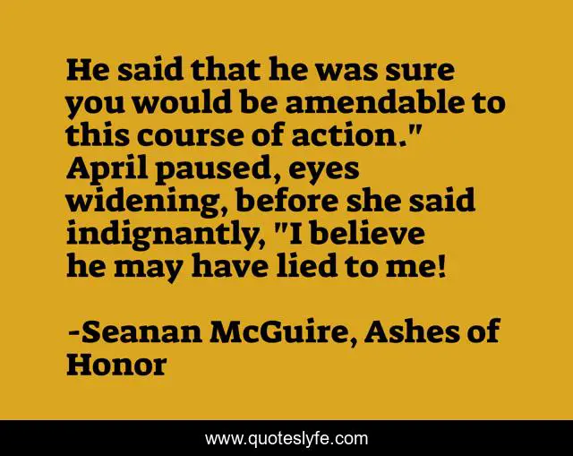 This page presents the quote "He said that he was sure you would be amendable to this course of action." April paused, eyes widening, before she said indignantly, "I believe he may have lied to me!". Author of this quote is Seanan McGuire, Ashes of Honor. This quote is about lies, empathy, humor,.