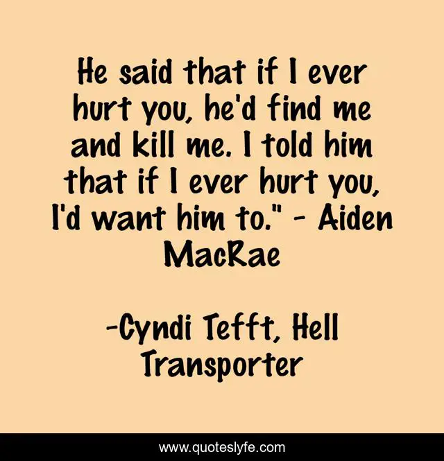 This page presents the quote "He said that if I ever hurt you, he'd find me and kill me. I told him that if I ever hurt you, I'd want him to." - Aiden MacRae". Author of this quote is Cyndi Tefft, Hell Transporter. This quote is about ya, sweet, heartbreaking, scotland, paranormal-romance,.