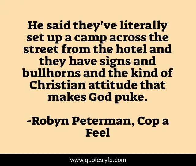 This page presents the quote "He said they've literally set up a camp across the street from the hotel and they have signs and bullhorns and the kind of Christian attitude that makes God puke.". Author of this quote is Robyn Peterman, Cop a Feel. This quote is about comedy, contemporary, romance-novels,.