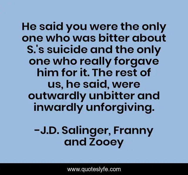 This page presents the quote "He said you were the only one who was bitter about S.'s suicide and the only one who really forgave him for it. The rest of us, he said, were outwardly unbitter and inwardly unforgiving.". Author of this quote is J.D. Salinger, Franny and Zooey. This quote is about death, suicide, forgiveness, bitterness, family,.
