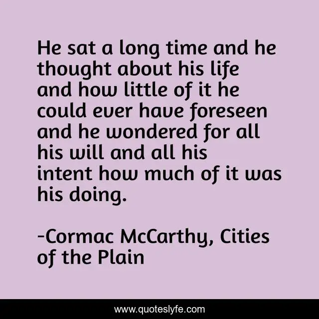 This page presents the quote "He sat a long time and he thought about his life and how little of it he could ever have foreseen and he wondered for all his will and all his intent how much of it was his doing.". Author of this quote is Cormac McCarthy, Cities of the Plain. .