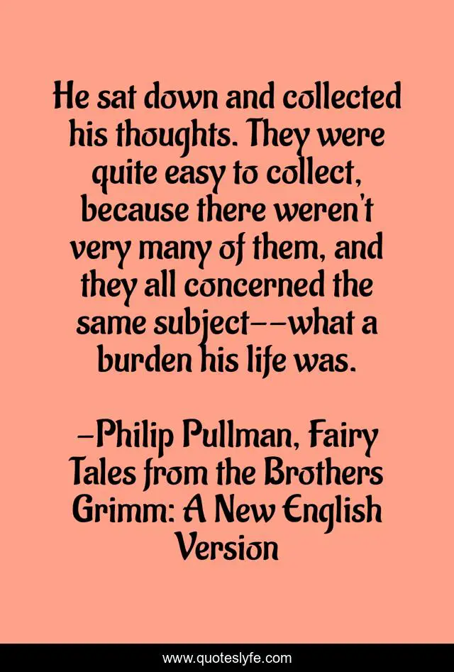 This page presents the quote "He sat down and collected his thoughts. They were quite easy to collect, because there weren't very many of them, and they all concerned the same subject--what a burden his life was.". Author of this quote is Philip Pullman, Fairy Tales from the Brothers Grimm: A New English Version. This quote is about thinking, life, difficulties, troubles, thoughts,.