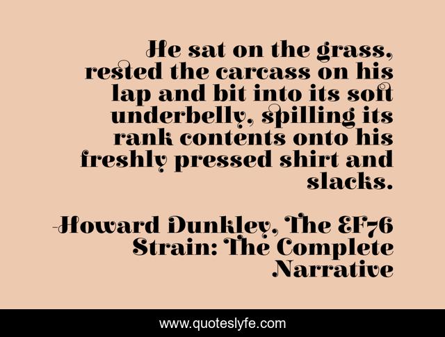 This page presents the quote "He sat on the grass, rested the carcass on his lap and bit into its soft underbelly, spilling its rank contents onto his freshly pressed shirt and slacks.". Author of this quote is Howard Dunkley, The EF76 Strain: The Complete Narrative. This quote is about horror, zombie-thriller, zombies,.