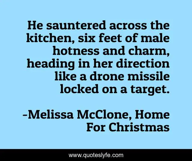 This page presents the quote "He sauntered across the kitchen, six feet of male hotness and charm, heading in her direction like a drone missile locked on a target.". Author of this quote is Melissa McClone, Home For Christmas. This quote is about contemporary-romance, cowboy, baker, ranch-romance, western-romance, small-town-romance, cowboy-romance,.
