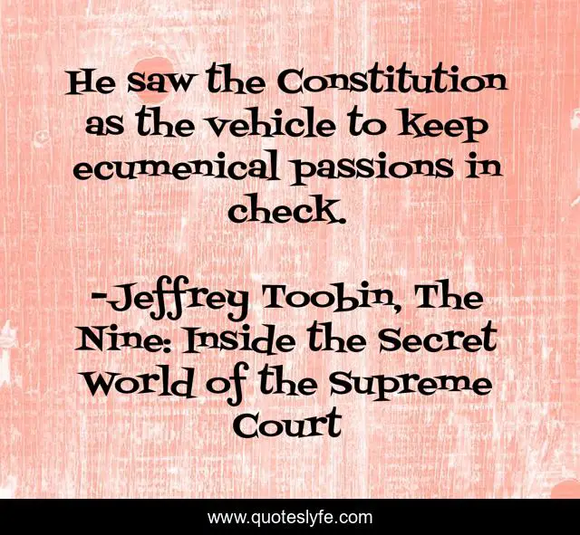 This page presents the quote "He saw the Constitution as the vehicle to keep ecumenical passions in check.". Author of this quote is Jeffrey Toobin, The Nine: Inside the Secret World of the Supreme Court. This quote is about culture, civic-fabric, factionalism, church-and-state,.