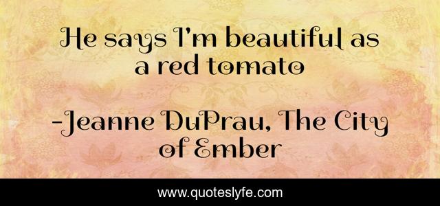 This page presents the quote "He says I'm beautiful as a red tomato". Author of this quote is Jeanne DuPrau, The City of Ember. This quote is about humor, fiction,.