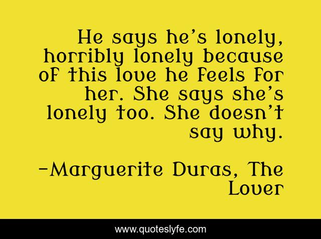 This page presents the quote "He says he’s lonely, horribly lonely because of this love he feels for her. She says she’s lonely too. She doesn’t say why.". Author of this quote is Marguerite Duras, The Lover. This quote is about the-lover, lonely, love, marguerite-duras, affection,.