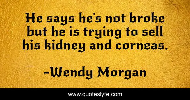 This page presents the quote "He says he's not broke but he is trying to sell his kidney and corneas.". Author of this quote is Wendy Morgan. .