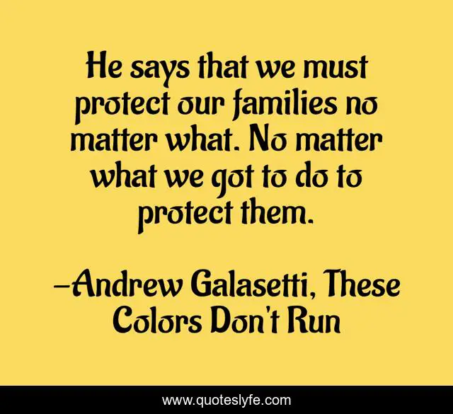 This page presents the quote "He says that we must protect our families no matter what. No matter what we got to do to protect them.". Author of this quote is Andrew Galasetti, These Colors Don't Run. This quote is about protective, family, wife, fathers, men, safety, fatherhood, children,.