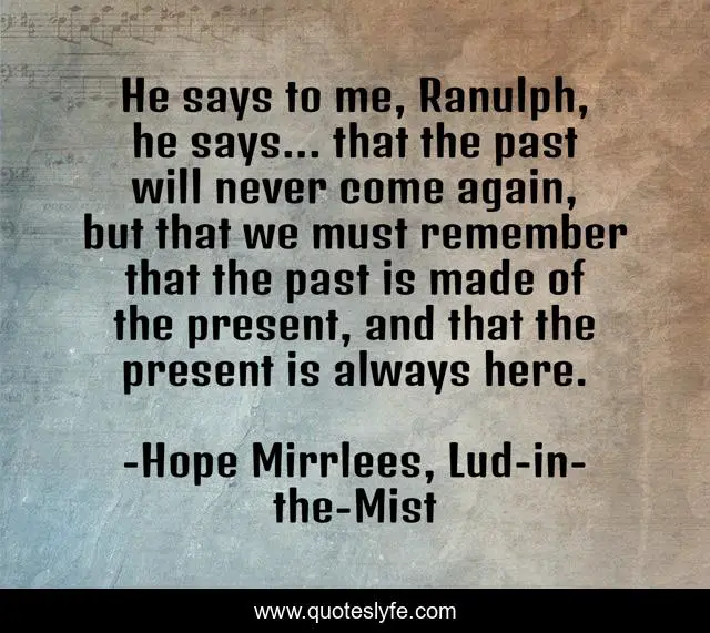 This page presents the quote "He says to me, Ranulph, he says... that the past will never come again, but that we must remember that the past is made of the present, and that the present is always here.". Author of this quote is Hope Mirrlees, Lud-in-the-Mist. This quote is about past, ranulph-chanticleer, nathaniel-chanticleer, present,.